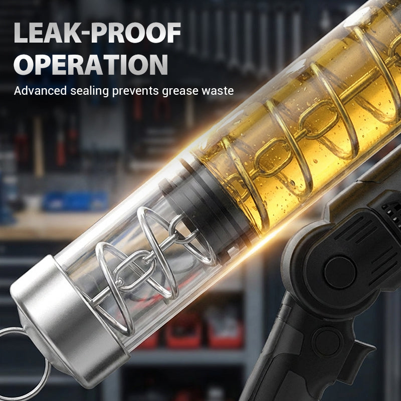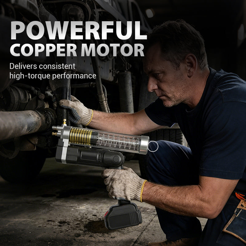 LEISTUNGSSTARKER KUPFERMOTOR – Ausgestattet mit einem robusten Motor aus reinem Kupfer, der eine konstante Leistung und ein hohes Drehmoment liefert und so eine schnelle und gleichmäßige Fettverteilung gewährleistet, selbst bei anspruchsvollen Schmieraufgaben an schweren Maschinen.